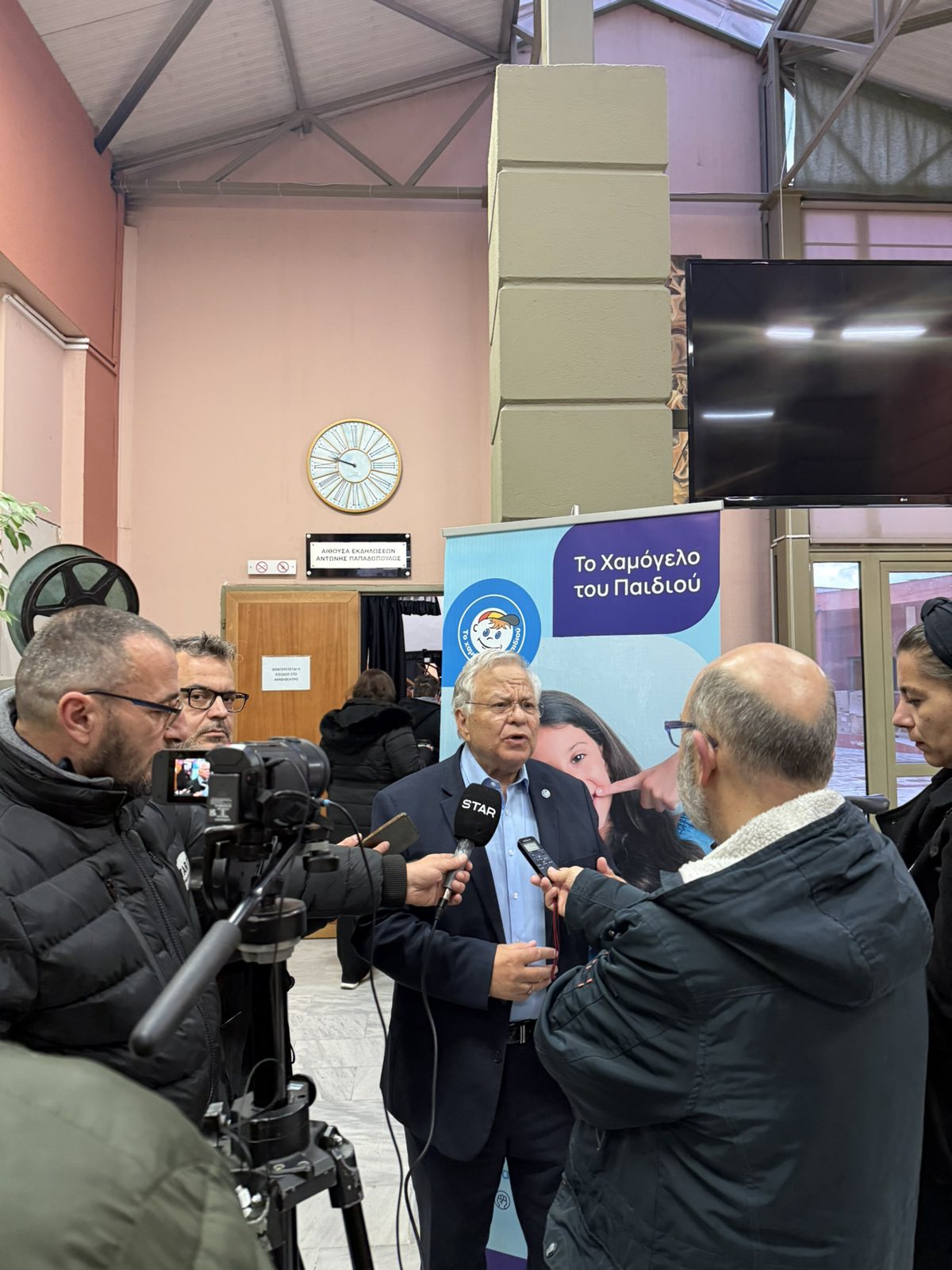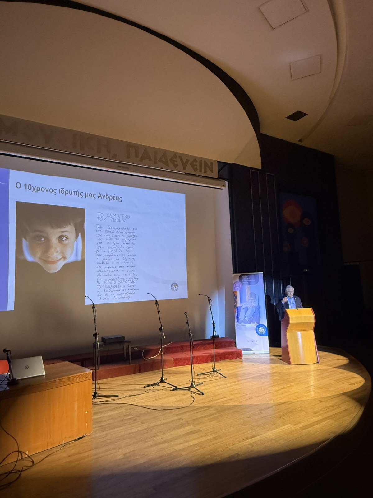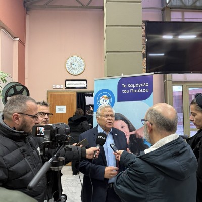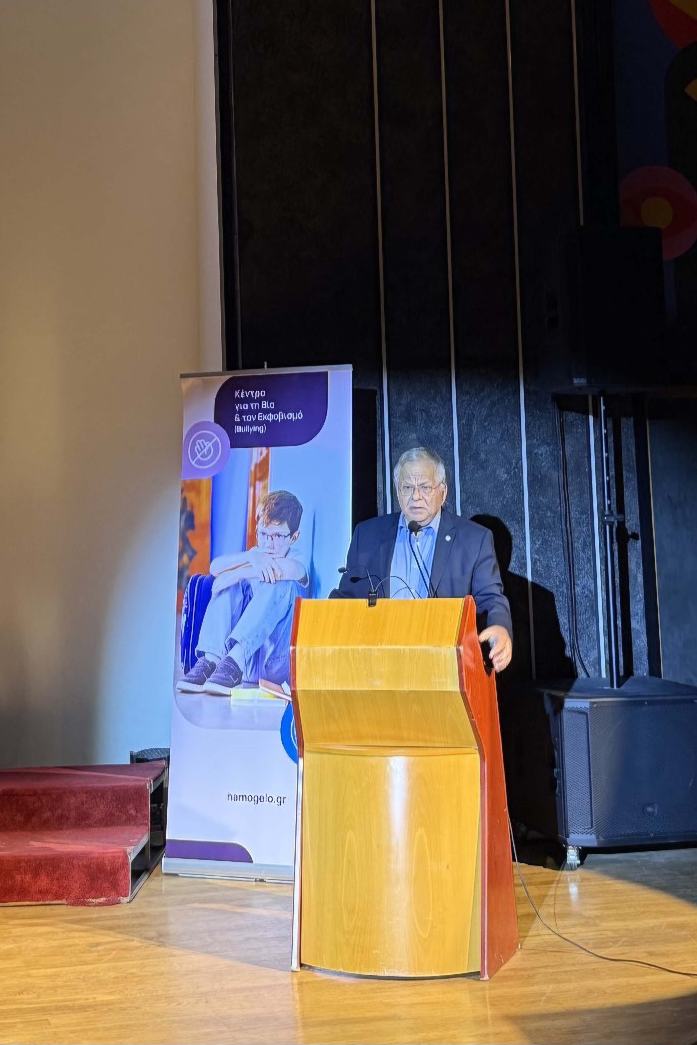 Η παρουσία του κ. Κώστα Γιαννόπουλου, ήταν ιδιαίτερα σημαντική και ξεχωριστή για τη διοργάνωση. Αμέσως μετά τους χαιρετισμούς των επικεφαλής των φορέων, ο Πρόεδρος του Οργανισμού «Το Χαμόγελο του Παιδιού» κ. Κώστας Γιαννόπουλος, ανέβηκε στο βήμα και κατέθεσε με έμφαση την αμέριστη υποστήριξη του Οργανισμού στη δράση κατά της σχολικής βίας. Σε μια ομιλία που συγκίνησε και ενθουσίασε το κοινό, ο Πρόεδρος κ. Κώστας Γιαννόπουλος παρουσίασε αναλυτικά το πολύπλευρο έργο του Οργανισμού, ο οποίος ξεκίνησε από το όραμα ενός παιδιού - του «Ανδρέα» - και σήμερα αποτελεί έναν από τους σημαντικότερους μη κερδοσκοπικούς οργανισμούς στην Ελλάδα. Όπως τόνισε χαρακτηριστικά, ο Οργανισμός «Το Χαμόγελο του Παιδιού» δεν περιορίζεται μόνο στην άμεση υποστήριξη, αλλά έχει ενεργή και διαρκή παρουσία μέσα στα σχολεία σε ολόκληρη την επικράτεια, υλοποιώντας προγράμματα πρόληψης και ευαισθητοποίησης για τον σχολικό εκφοβισμό, ενώ παράλληλα παρέχει εξειδικευμένη ψυχολογική υποστήριξη σε μαθητές, εκπαιδευτικούς και γονείς μέσω των επιστημονικών ομάδων ψυχολόγων και κοινωνικών λειτουργών του Οργανισμού. Με ιδιαίτερη έμφαση, αναφέρθηκε στις κρίσιμες δράσεις στήριξης που προσφέρει ο Οργανισμός «Το Χαμόγελο του Παιδιού» σε εκατομμύρια παιδιά και οικογένειες, όπως η 24ωρη Εθνική Τηλεφωνική Γραμμή SOS 1056, το Chat 1056, τα σπίτια φιλοξενίας για παιδιά που βρίσκονται σε κίνδυνο και οι εξειδικευμένες υπηρεσίες ψυχοκοινωνικής στήριξης.