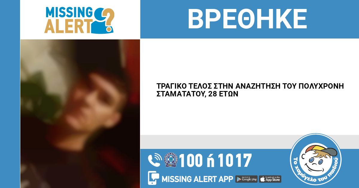 Να υπενθυμίσουμε, ότι ο Πολυχρόνης Σταματάτος, 28 ετών, εξαφανίστηκε στις 03/04/2026 από την περιοχή της Καισαριανής. Το «Χαμόγελο του Παιδιού» ενημερώθηκε για την εξαφάνιση του Πολυχρόνη Σταματάτου ενημερώθηκε στις 07/04/2026  και άμεσα προχώρησε στη δημοσιοποίηση των στοιχείων του ενήλικου, κατόπιν αιτήματος της οικογένειάς του, καθώς συνέτρεχαν λόγοι, οι οποίοι έθεταν τη ζωή του σε κίνδυνο.