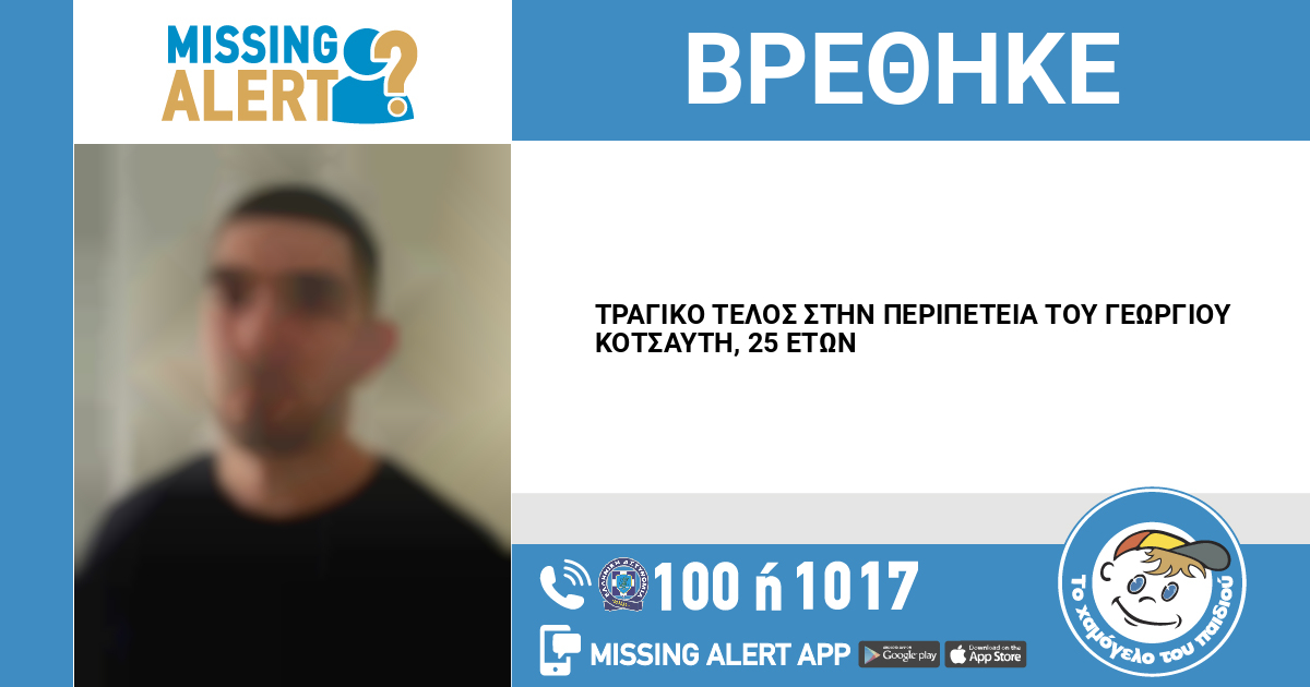 Η περιπέτεια του Γεώργιου Κοτσαύτη, 25 ετών, έληξε με τραγικό τρόπο, βυθίζοντας στη θλίψη τους δικούς του ανθρώπους που τον αναζητούσαν. Ο ενήλικας, σύμφωνα με τις πρώτες πληροφορίες, εντοπίστηκε νεκρός στην περιοχή της Αγίας Παρασκευής. Τα αίτια θανάτου του διερευνώνται από τις Αρμόδιες Αρχές.