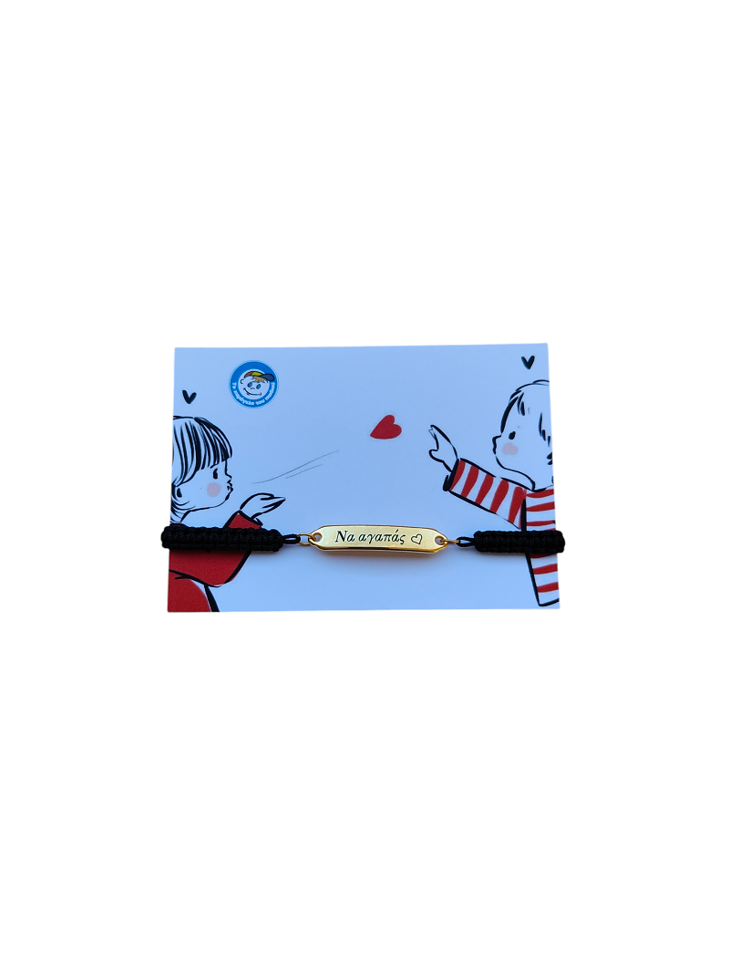 Βραχιολάκι μακραμέ με μεταλλικό στοιχείο σε χρυσό χρώμα και εκτυπωμένη τη φράση "Να αγαπάς". Ρυθμιζόμενο κλείσιμο. Τοποθετημένο σε καρτελάκι με το λογότυπο του οργανισμού. Δημιουργία της ομάδας του Εθελοντικού Εργαστηρίου του Οργανισμού μας.