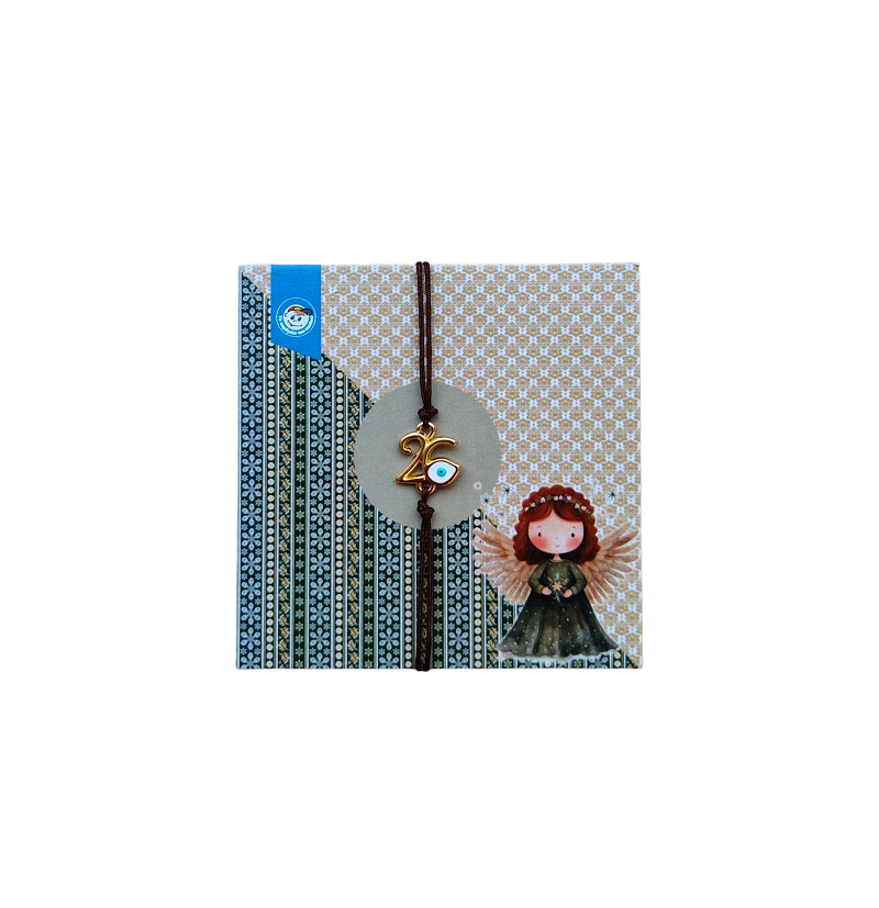 Βραχιολάκι-γούρι με μεταλλικό στοιχείο '26, δεμένο σε κηρόσκοινο. Τοποθετημένο σε τετράγωνο καρτελάκι. Δημιουργία της ομάδας του Εθελοντικού Εργαστηρίου του Οργανισμού μας.