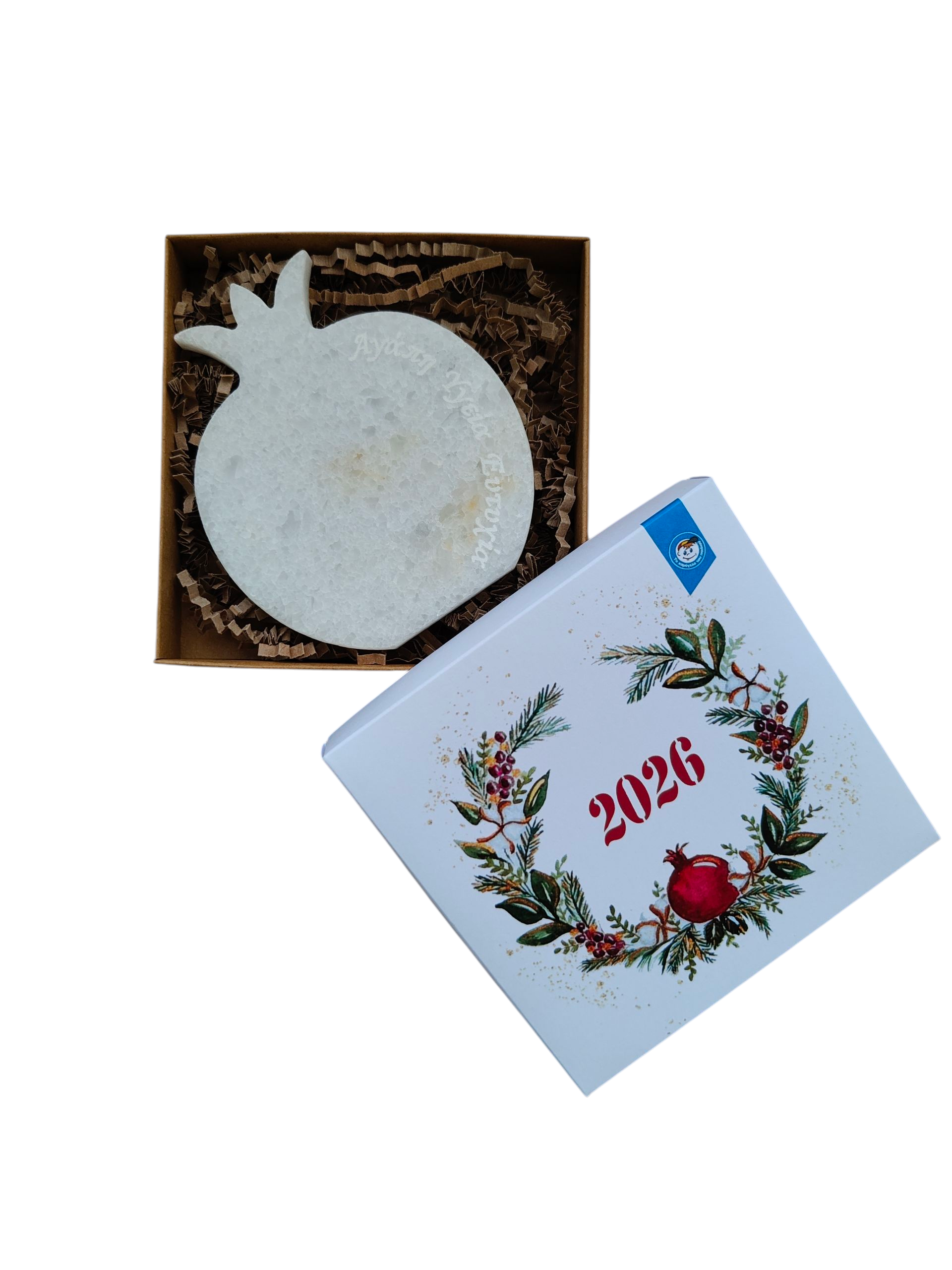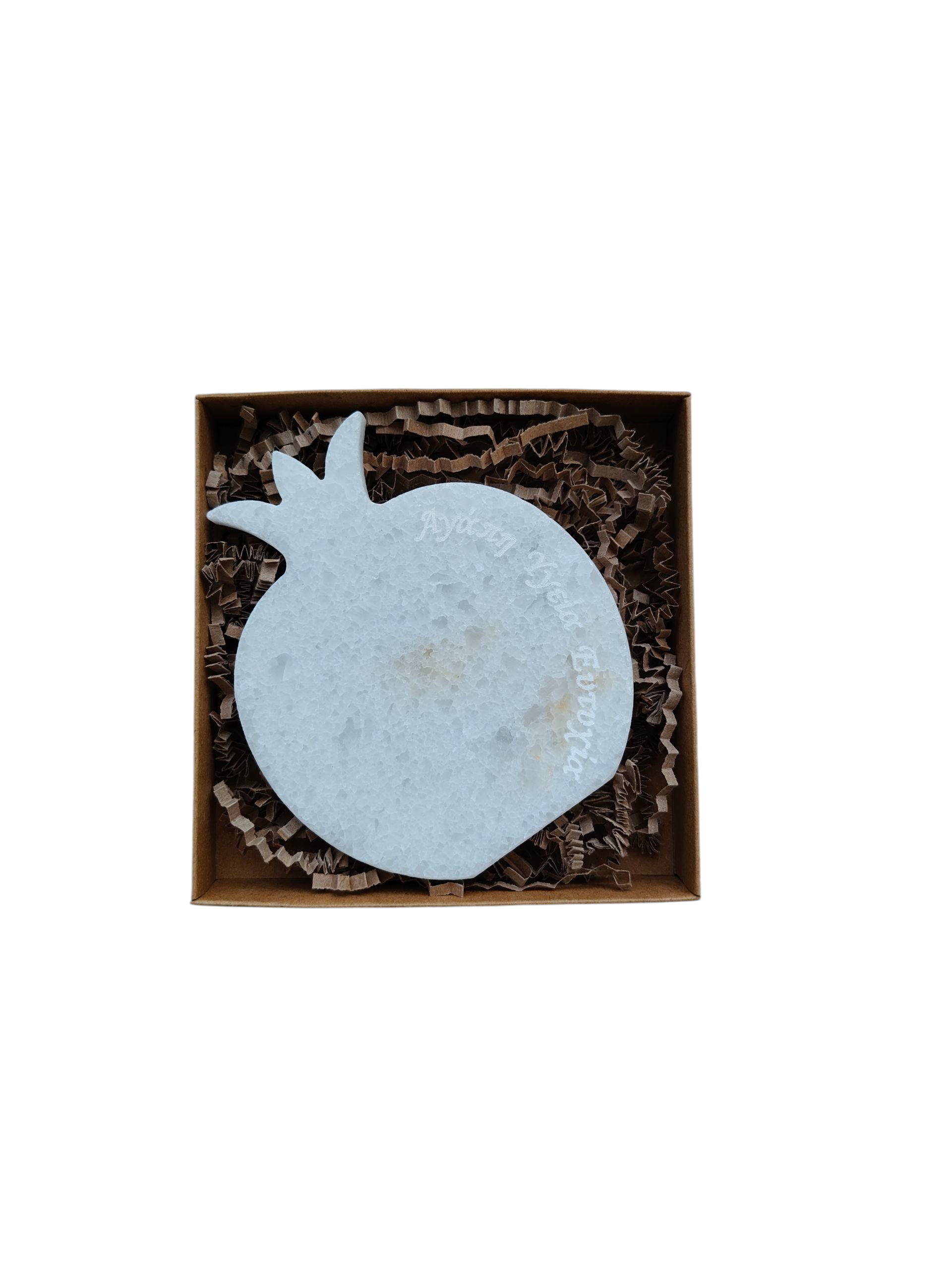 Χειροποίητο μαρμάρινο σουβέρ γούρι με ευχές σε σχήμα ρόδι. Διατίθεται σε κουτάκι δώρου. Τα γούρι είναι δημιουργία και ευγενική διάθεση της εταιρείας Soil Naxian Creations.
