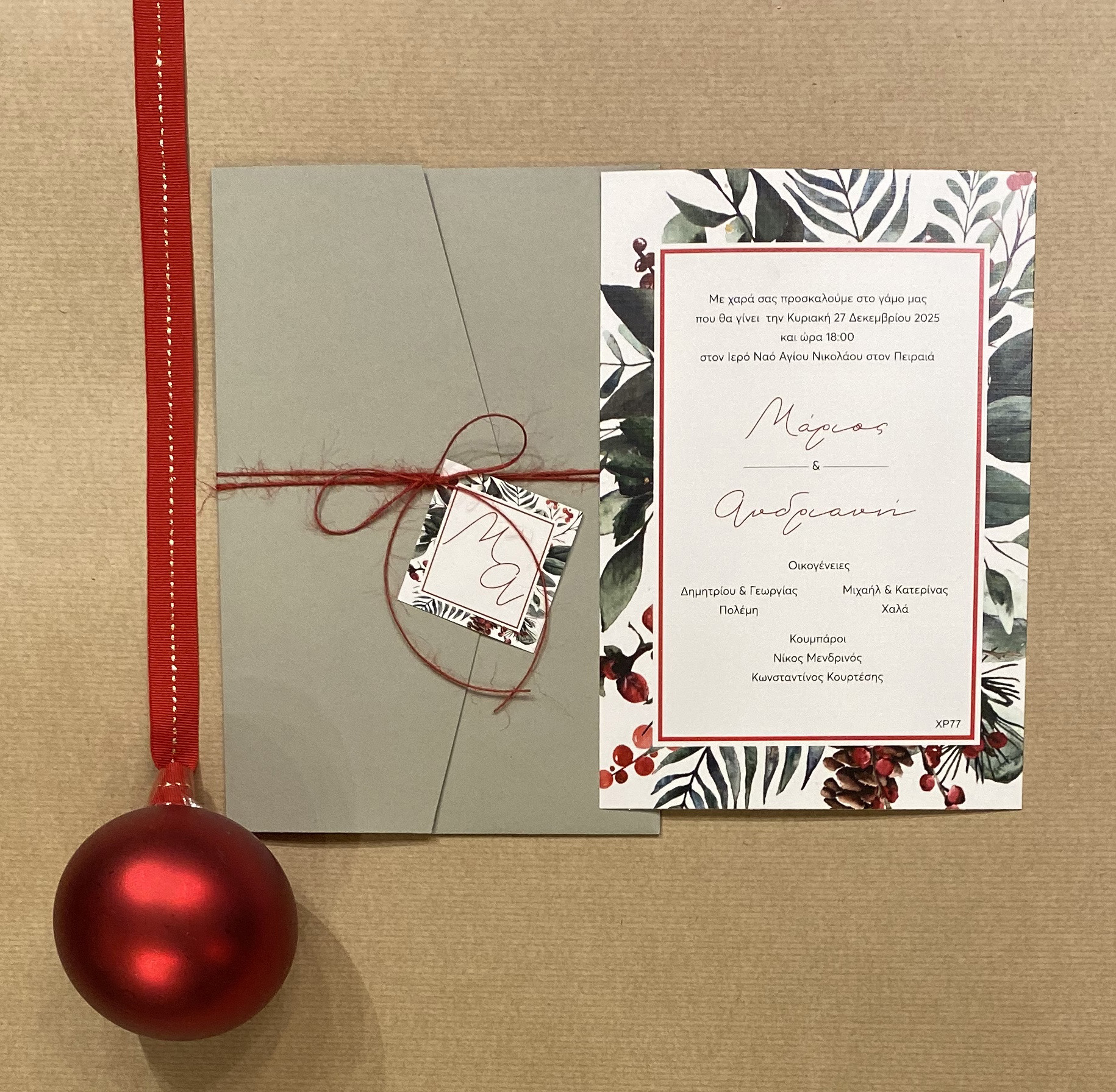 Το προσκλητήριο επιμέλειας συνεργαζόμενου τυπογραφείου, τυπώνεται σε χαρτί λευκό ματ γκοφρέ με ιδιαίτερη υφή 300γρ. Στην τιμή συμπεριλαμβάνεται φάκελος από πράσινο-χακί ματ γκοφρέ με ιδιαίτερη υφή χαρτί 300γρ με διάσταση 22 Χ 15 εκ Ο φάκελος δένεται περιμετρικά με κορδόνι σε χρώμα κόκκινο. Συνοδεύεται με διακοσμητικό καρτάκι εκτυπωμένο με το ίδιο θέμα.
