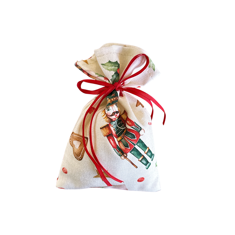 Χριστουγεννιάτικη μπομπονιέρα βάπτισης υφασμάτινο πουγκί (12χ17cm) με σχέδιο μολυβένιο στρατιώτη. Δένεται με κόκκινο κορδελάκι.
