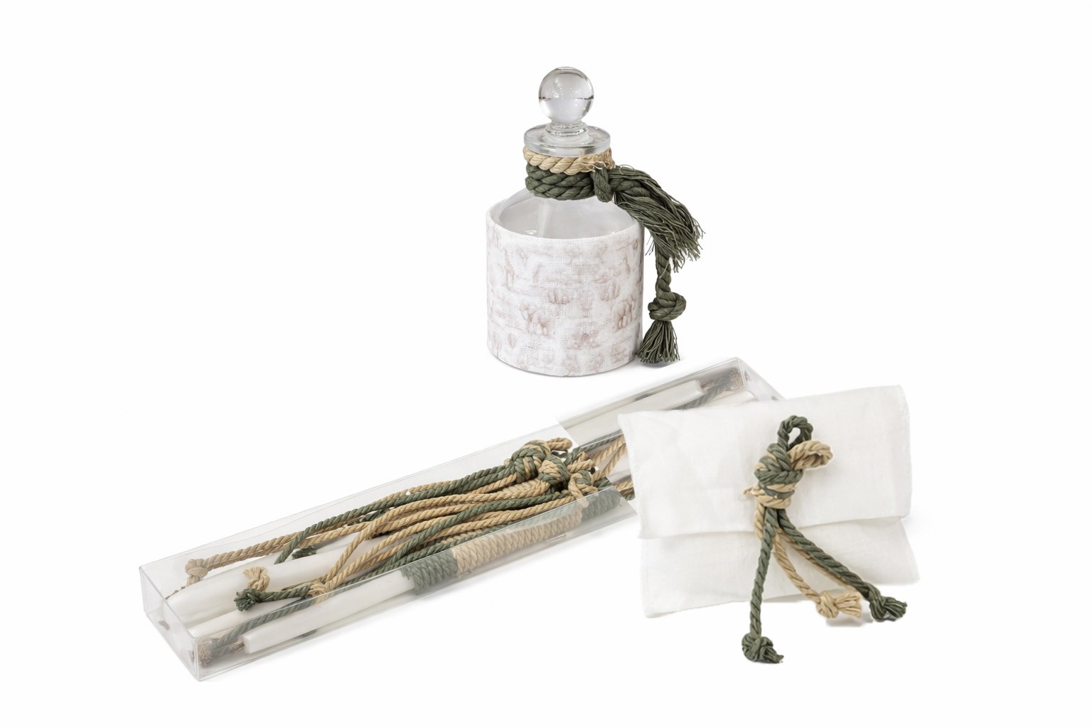 Λαδοσέτ το οποίο περιλαμβάνει μπουκαλάκι λαδιού, σαπουνάκι και τρία κεράκια διακοσμημένα