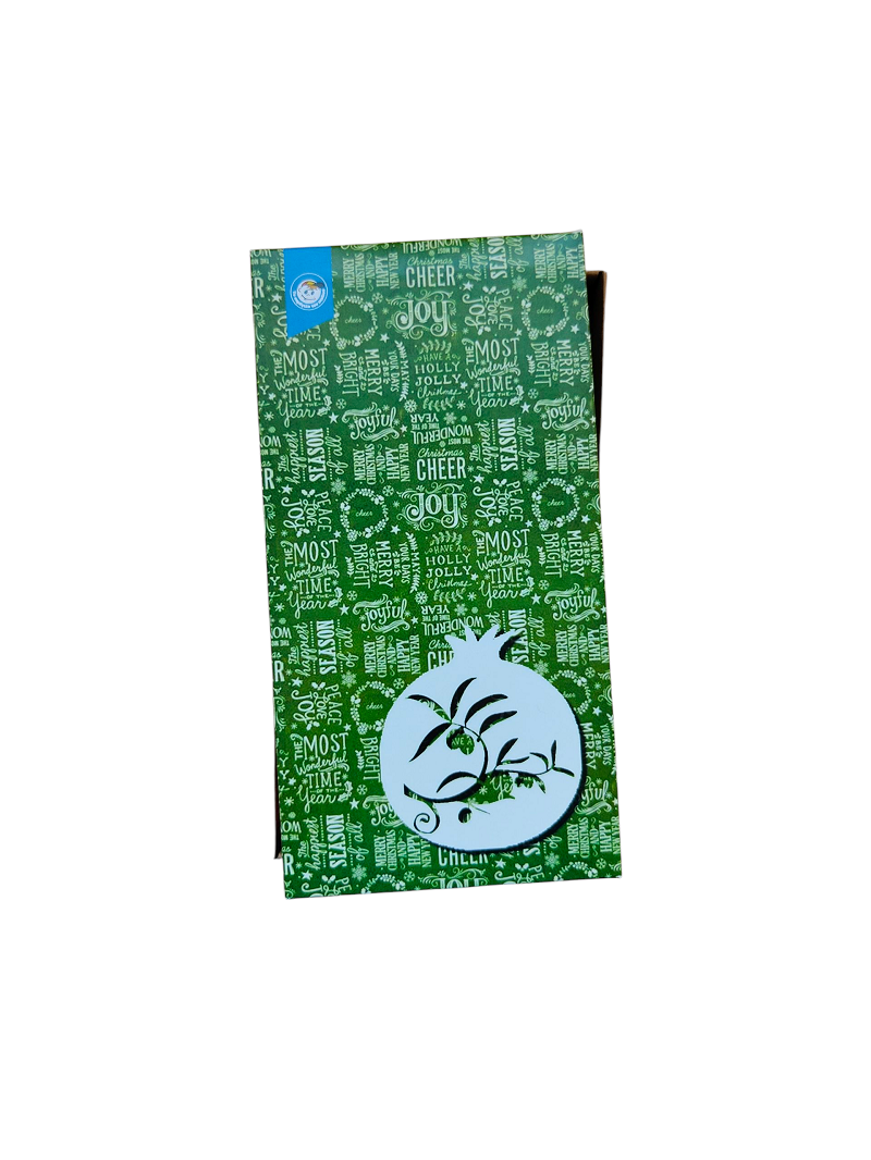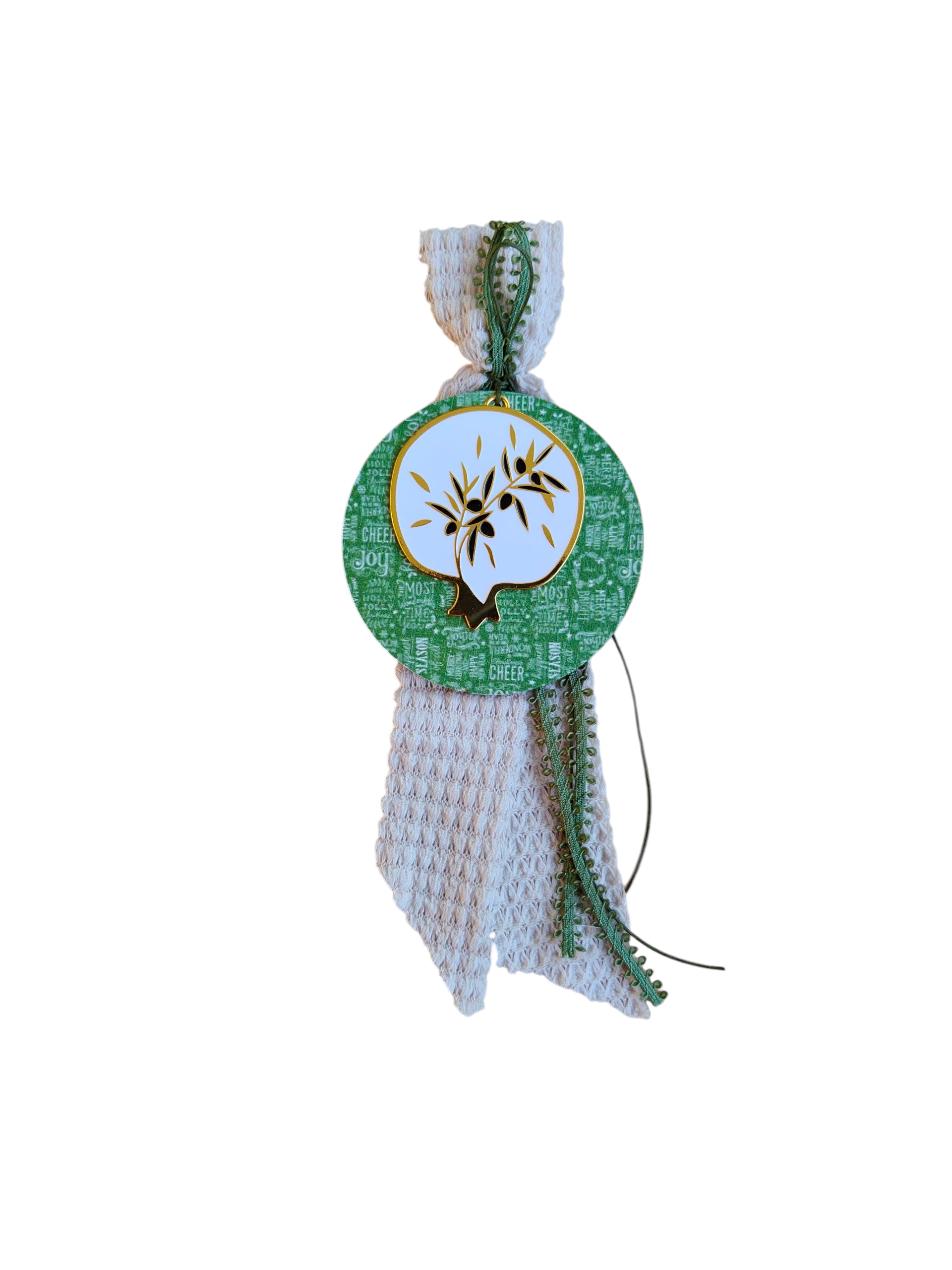 Γούρι στολίδι με μεταλλικό στοιχείο ρόδι με κλαδιά ελιάς τοποθετημένο πάνω σε ξύλινο πράσινο διακοσμητικό. Διακοσμημένο με κορδέλες. Δημιουργία της ομάδας του Εθελοντικού Εργαστηρίου του Οργανισμού μας.