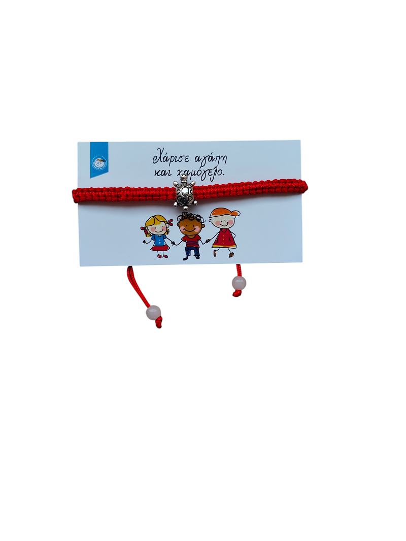 Χειροποίητο βραχιολάκι μακραμέ με χελωνάκι, σε κόκκινο χρώμα. Δημιουργία της ομάδας εθελοντών του Δημιουργικού Εργαστηρίου.
