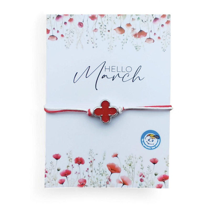 Χειροποίητο μαρτιάτικο βραχιολάκι με μεταλλικό σταυρουδάκι σε κόκκινο χρώμα. Το βραχιολάκι διατίθεται δεμένο σε καρτελάκι με το μήνυμα "Hello March" και το λογότυπο του Οργανισμού. Στην πίσω όψη θα βρείτε την ιστορία του εθίμου. Το βραχιολάκι είναι συσκευασμένο σε διάφανο σακουλάκι. Δημιουργία της ομάδας εθελοντών του Δημιουργικού Εργαστηρίου.