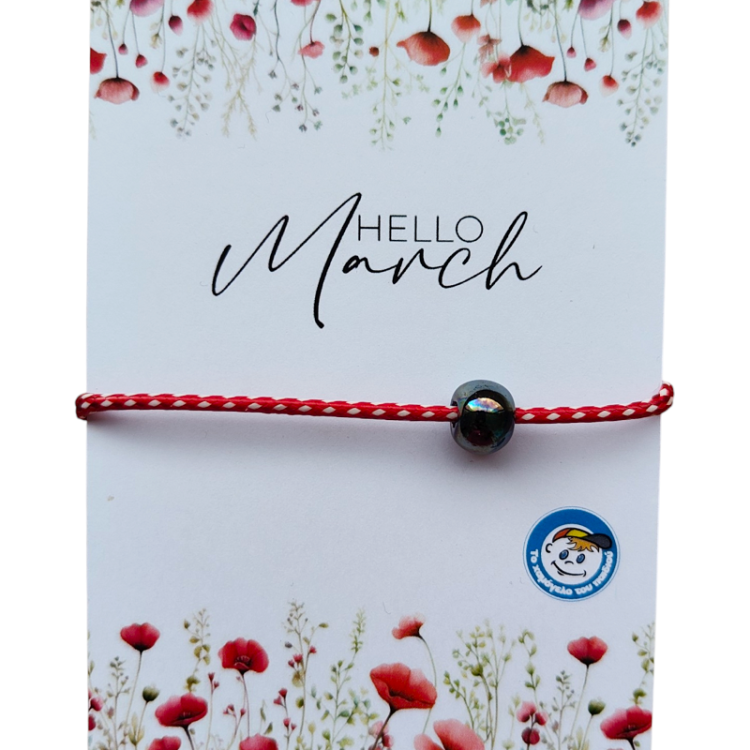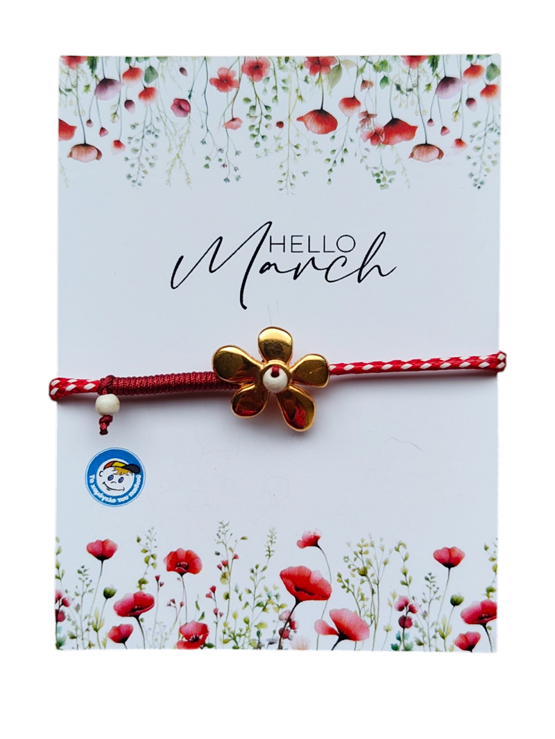 Χειροποίητο μαρτιάτικο βραχιολάκι με χρυσό λουλούδι . Το βραχιόλι διατίθεται δεμένο σε καρτελάκι με το μήνυμα "Hello March" και το λογότυπο του Οργανισμού. Στην πίσω όψη θα βρείτε την ιστορία του εθίμου. Το βραχιόλι είναι συσκευασμένο σε διάφανο σακουλάκι. Δημιουργία της ομάδας εθελοντών του Δημιουργικού Εργαστηρίου.