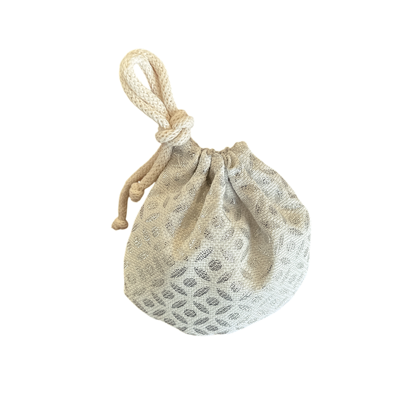 Χριστουγεννιάτικη μπομπονιέρα γάμου από ζακάρ πουγκί (13x14) σε οβάλ σχεδιασμό, σε χρώμα εκρού - ασημί.