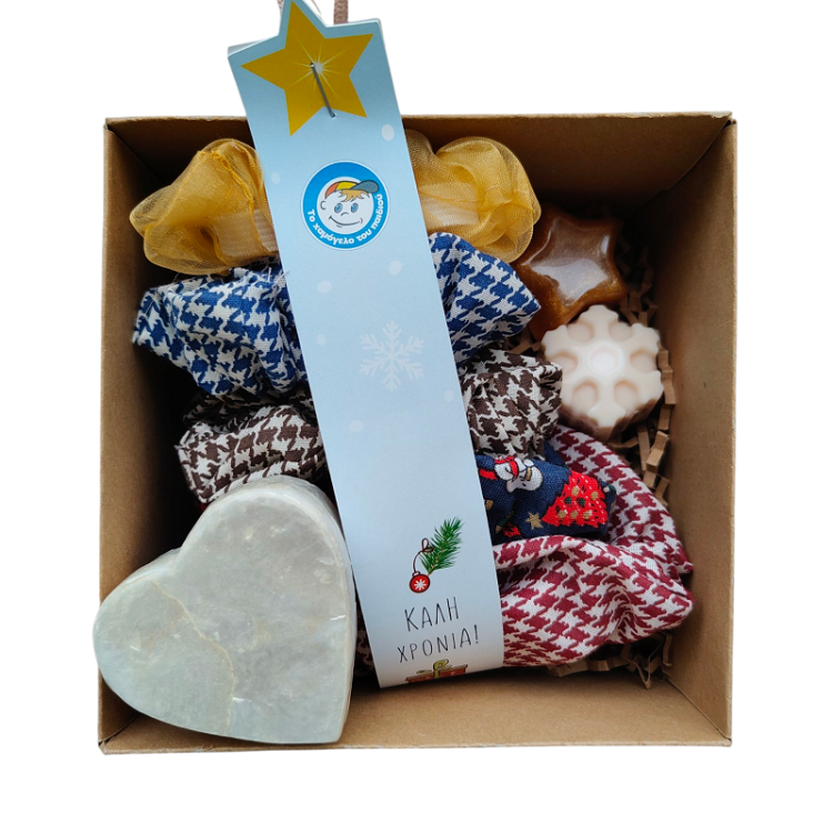 Πακέτο δώρου με λούτρινο αρκουδάκι, φυσικό σφουγγαράκι μπάνιου (της εταιρεία Physis-Μακρύλλος Μανώλης) και δύο συσκευασίες παιδική κρέμα περιποίησης σώματος με βιολογικό ελαιόλαδο, γάλα γαϊδάρας, αργκάν και βιολογική αλόη (από την εταιρεία Venus Secret).