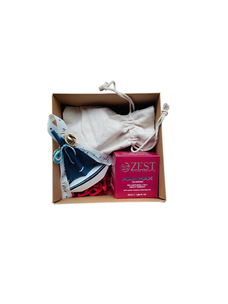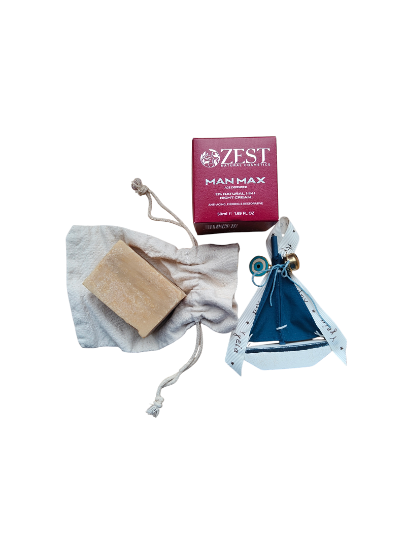 -Man Max Age Defender 92% φυσική κρέμα νυκτός 3 σε 1. Μια ολοκληρωμένη φυσική συνταγή, ειδικά σχεδιασμένη για να αναδομεί, να τονώνει και να ενυδατώνει την ανδρική επιδερμίδα στο μέγιστο. Με εκχυλίσματα τσουκνίδας, ιπποφαούς, αμαμελίδας, αλθαίας και χαμομηλιού περιέχει πλούσια επανορθωτικά, συσφικτικά και καταπραϋντικά στοιχεία. Ενισχυμένη με βούτυρο καριτέ, έλαιο αβοκάντο και ελαιο Jojoba, προσφέρει ελαστικότητα, ισορροπία και θρέψη σε βάθος. Τα αιθέρια έλαια λεβάντας, γκρέιπφρουτ, τεϊόδεντρου και μανταρινιού ολοκληρώνουν τη σύνθεση και χαρίζουν αντιφλεγμονώδης και αντισηπτική δράση συνοδευόμενη από ένα διακριτικά αρρενωπό άρωμα. 50ml (προσφορά της εταιρείας Φυσικών καλλυντικών ΖΕST)