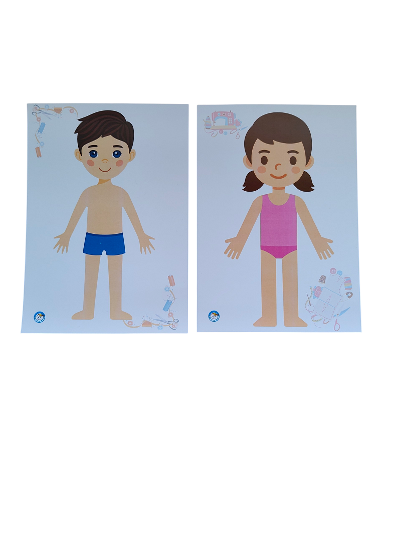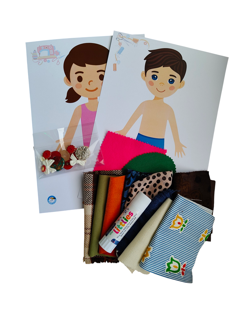 Τα παιδιά επιλέγουν υφάσματα, τα κόβουν στο σχήμα που θέλουν, συνδυάζουν χρώματα και υφές και κολλούν τα υλικά πάνω στις φιγούρες, δημιουργώντας μοναδικά ρούχα και στυλ. Ιδανικό για δημιουργική απασχόληση στο σπίτι ή στο σχολείο.