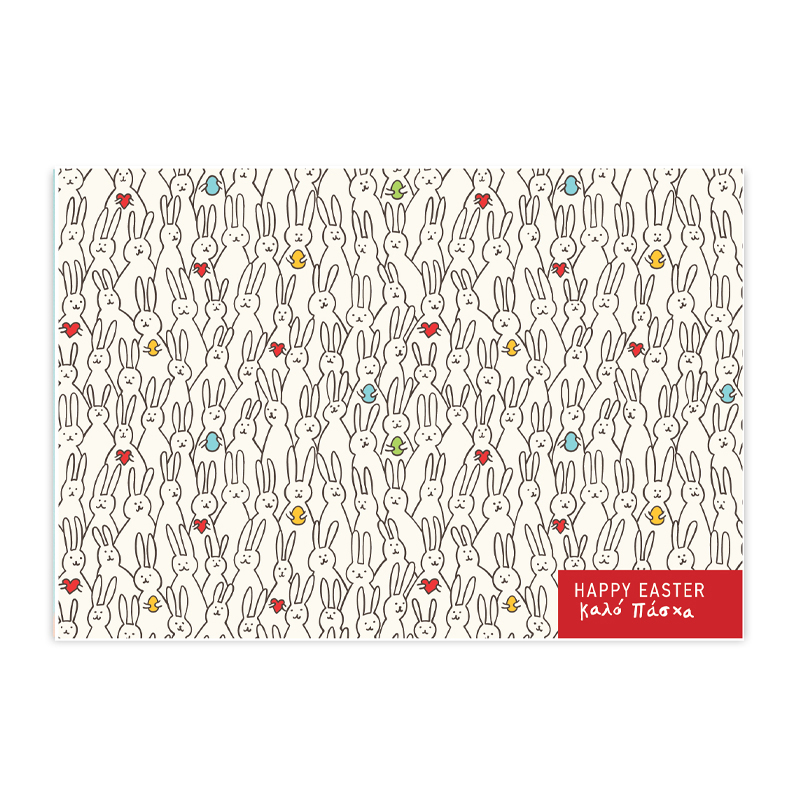 Ευχετήρια κάρτα για το Πάσχα. Η κάρτα είναι δίφυλλη με διάσταση 12 Χ 16,8 εκ. (κλειστή) και είναι εκτυπωμένη σε χαρτί velvet 300 γραμμαρίων. Κενή εσωτερικά για να γράψετε τις δικές σας ευχές. Περιλαμβάνεται λευκός φάκελος.
