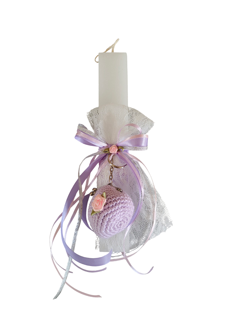Χειροποίητη πασχαλινή λαμπάδα σε λευκό πλακέ αρωματικό κερί, με χειροποίητο κρεμαστό πλεκτό πορτοφολάκι, στολισμένη με διάφορες κορδέλες. Η λαμπάδα είναι δημιουργία της ομάδας εθελοντών του Εργαστηρίου του Οργανισμού μας. Το χειροποίητο πορτοφολάκι είναι δημιουργία της εθελόντριάς μας, Στέλλας. Διατίθεται σε λαμπαδόκουτο.