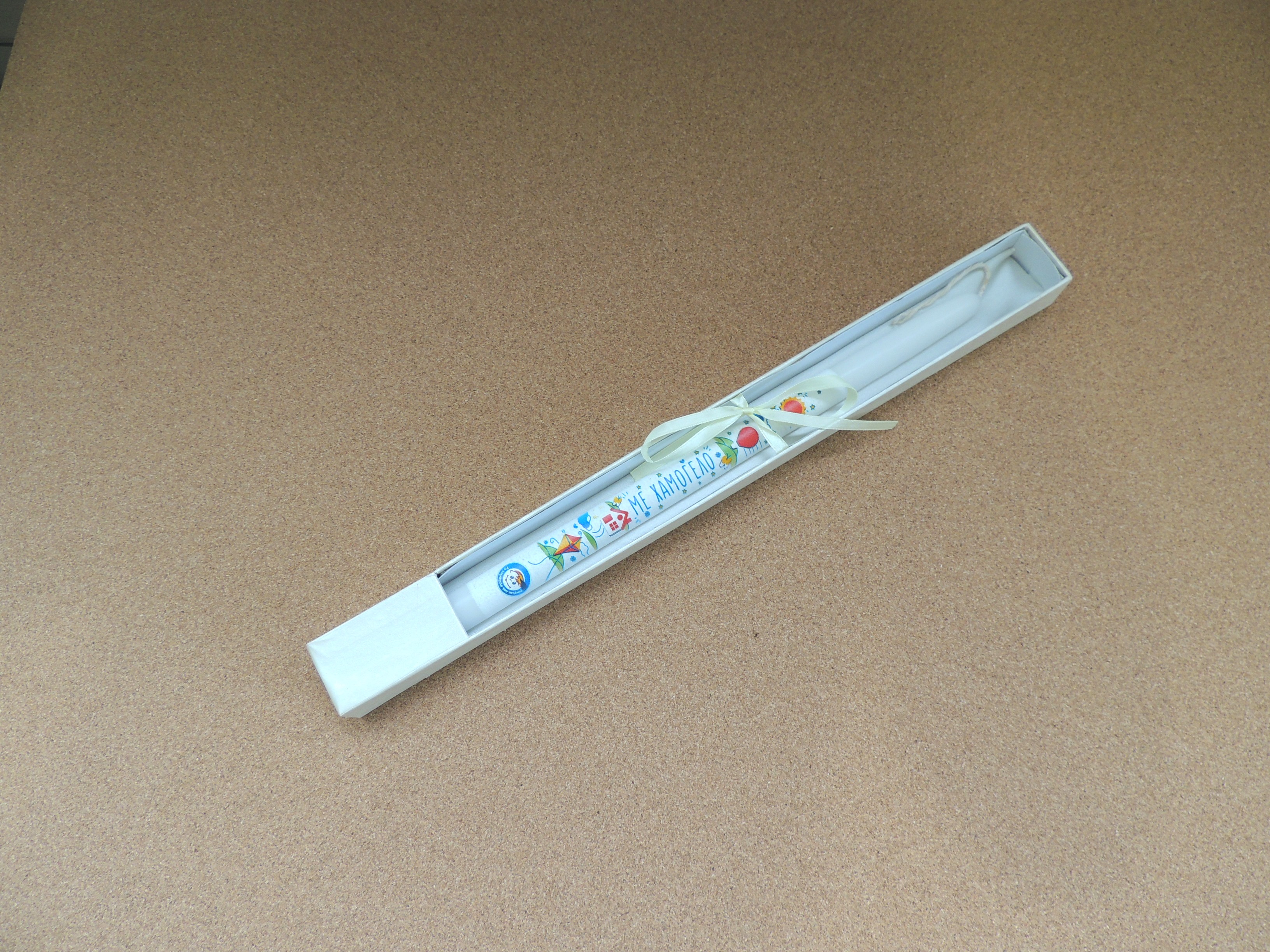Πασχαλινή Λαμπάδα " Με Χαμόγελο" σε λευκό κερί ζωγραφισμένη με στοιχεία του εικαστικού μας. Ύψος: 38εκ.. Διατίθεται σε λαμπαδόκουτο.