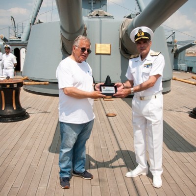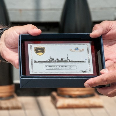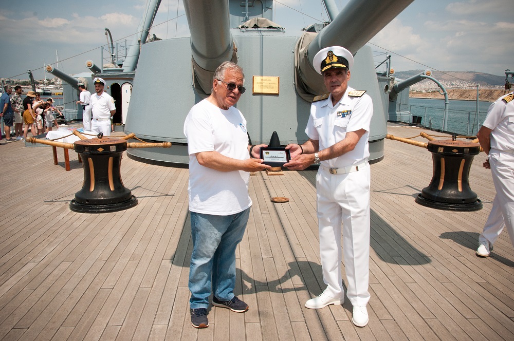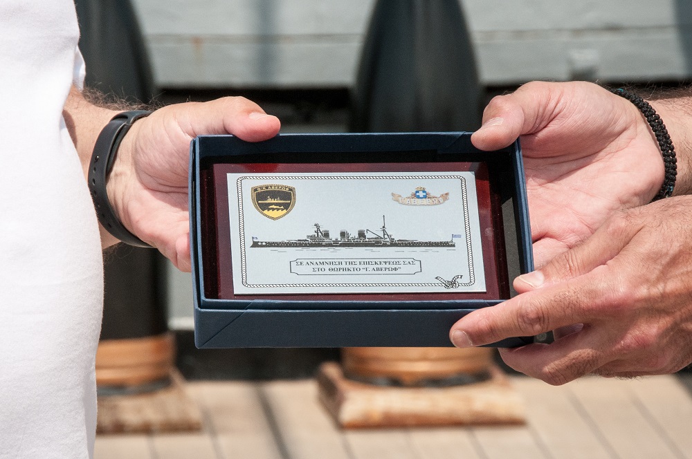 Ο Υποναύαρχος, Κυβερνήτης ΠΝΜ Θ/Κ Γ. Αβέρωφ, κος. Ιωάννης Καλογερόπουλος, καλωσόρισε τον Πρόεδρο του Οργανισμού, κ. Κώστα Γιαννόπουλο και του απένειμαν αναμνηστική πλακέτα με απεικόνιση της Ελληνικής Τριήρους καθώς και μια πλακέτα εις ανάμνηση της επισκέψεως του Οργανισμού στο Θωρηκτό ‘’Γ. Αβέρωφ’’.